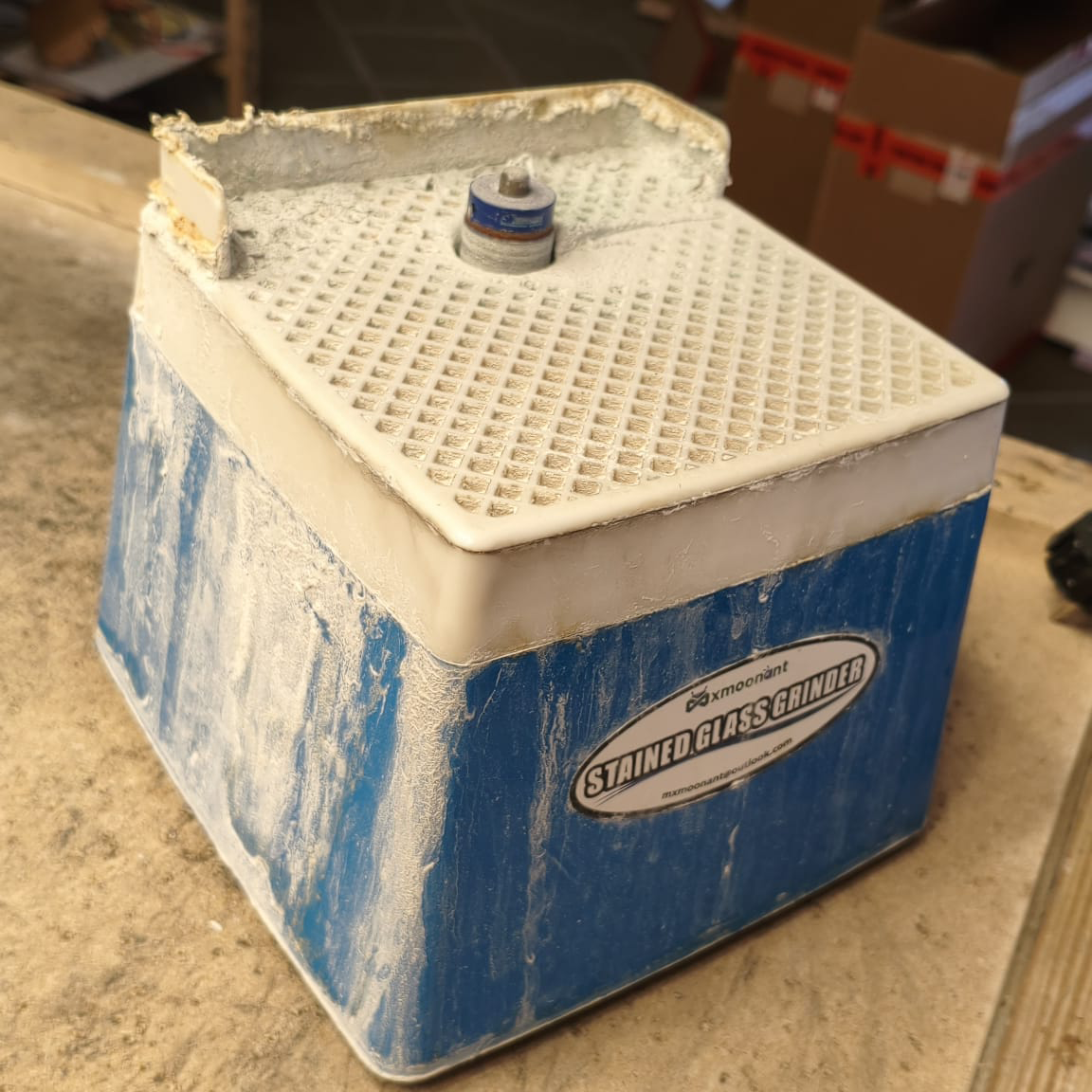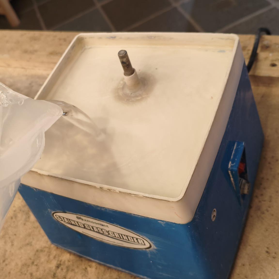 Szlifowanie odbywa się w środowisku wodnym, żeby szkło się ładnie szlifowało, a nie szczerbiło, a także żeby w powietrzu nie unosił się zabójczy szklany pył (to pierwsza z serii rzeczy, które próbują nas zabić w witrażowym studio), dlatego na tackę szlifierki nalewamy nieco wody: